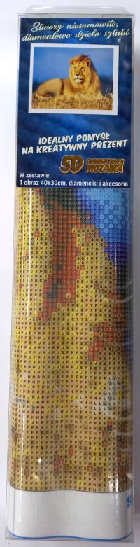 Balenie obsahuje: plátno s predtlačeným obrázkom, pero na aplikáciu kamienkov, misku na vysypanie kamienkov, vosk na nalepenie, sadu farebných kamienkov Diamantové maľovanie - postup: Horná strana plátna je potiahnutá lepidlom a prekrytá priehľadnou fóliou. Fóliu dávajte dole postupne po častiach tak, ako budete aplikovať kamienky. Pri sňatí celej fólie naraz sa môže lepiaca vrstva znečistiť a kamienky by nemuseli tak dobre držať. Plátno obsahuje znaky, ktoré sú uvedené v priloženej legende a odkazujú na príslušné vrecko s kamienkami označené číslom. Kamienky z daného vrecka vysypte do misky. Do hrotu pera naberte vosk, vďaka ktorému sa kamienky ľahko prichytia na pero. Kamienky perom nanášajte na obrázok. Po nalepení danej farby kamienky nasypte späť do vrecka a pokračujte s ďalšou farbou.