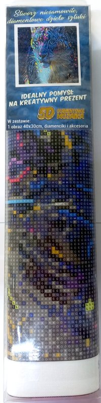 Balenie obsahuje: plátno s predtlačeným obrázkom, pero na aplikáciu kamienkov, misku na vysypanie kamienkov, vosk na nalepenie, sadu farebných kamienkov Diamantové maľovanie - postup: Horná strana plátna je potiahnutá lepidlom a prekrytá priehľadnou fóliou. Fóliu dávajte dole postupne po častiach tak, ako budete aplikovať kamienky. Pri sňatí celej fólie naraz sa môže lepiaca vrstva znečistiť a kamienky by nemuseli tak dobre držať. Plátno obsahuje znaky, ktoré sú uvedené v priloženej legende a odkazujú na príslušné vrecko s kamienkami označené číslom. Kamienky z daného vrecka vysypte do misky. Do hrotu pera naberte vosk, vďaka ktorému sa kamienky ľahko prichytia na pero. Kamienky perom nanášajte na obrázok. Po nalepení danej farby kamienky nasypte späť do vrecka a pokračujte s ďalšou farbou.