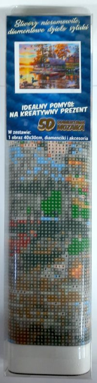 Balenie obsahuje: plátno s predtlačeným obrázkom, pero na aplikáciu kamienkov, misku na vysypanie kamienkov, vosk na nalepenie, sadu farebných kamienkov Diamantové maľovanie - postup: Horná strana plátna je potiahnutá lepidlom a prekrytá priehľadnou fóliou. Fóliu dávajte dole postupne po častiach tak, ako budete aplikovať kamienky. Pri sňatí celej fólie naraz sa môže lepiaca vrstva znečistiť a kamienky by nemuseli tak dobre držať. Plátno obsahuje znaky, ktoré sú uvedené v priloženej legende a odkazujú na príslušné vrecko s kamienkami označené číslom. Kamienky z daného vrecka vysypte do misky. Do hrotu pera naberte vosk, vďaka ktorému sa kamienky ľahko prichytia na pero. Kamienky perom nanášajte na obrázok. Po nalepení danej farby kamienky nasypte späť do vrecka a pokračujte s ďalšou farbou.