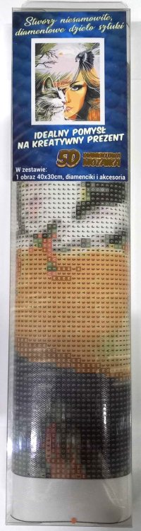 Balenie obsahuje: plátno s predtlačeným obrázkom, pero na aplikáciu kamienkov, misku na vysypanie kamienkov, vosk na nalepenie, sadu farebných kamienkov Diamantové maľovanie - postup: Horná strana plátna je potiahnutá lepidlom a prekrytá priehľadnou fóliou. Fóliu dávajte dole postupne po častiach tak, ako budete aplikovať kamienky. Pri sňatí celej fólie naraz sa môže lepiaca vrstva znečistiť a kamienky by nemuseli tak dobre držať. Plátno obsahuje znaky, ktoré sú uvedené v priloženej legende a odkazujú na príslušné vrecko s kamienkami označené číslom. Kamienky z daného vrecka vysypte do misky. Do hrotu pera naberte vosk, vďaka ktorému sa kamienky ľahko prichytia na pero. Kamienky perom nanášajte na obrázok. Po nalepení danej farby kamienky nasypte späť do vrecka a pokračujte s ďalšou farbou.