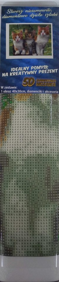 Balenie obsahuje: plátno s predtlačeným obrázkom, pero na aplikáciu kamienkov, misku na vysypanie kamienkov, vosk na nalepenie, sadu farebných kamienkov Diamantové maľovanie - postup: Horná strana plátna je potiahnutá lepidlom a prekrytá priehľadnou fóliou. Fóliu dávajte dole postupne po častiach tak, ako budete aplikovať kamienky. Pri sňatí celej fólie naraz sa môže lepiaca vrstva znečistiť a kamienky by nemuseli tak dobre držať. Plátno obsahuje znaky, ktoré sú uvedené v priloženej legende a odkazujú na príslušné vrecko s kamienkami označené číslom. Kamienky z daného vrecka vysypte do misky. Do hrotu pera naberte vosk, vďaka ktorému sa kamienky ľahko prichytia na pero. Kamienky perom nanášajte na obrázok. Po nalepení danej farby kamienky nasypte späť do vrecka a pokračujte s ďalšou farbou.