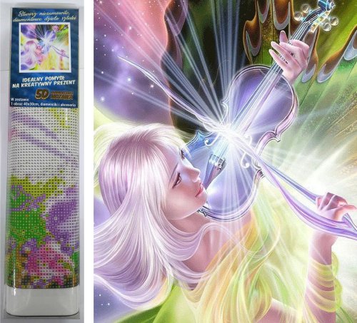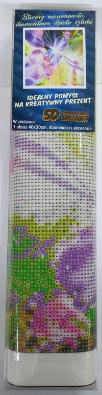 Balenie obsahuje: plátno s predtlačeným obrázkom, pero na aplikáciu kamienkov, misku na vysypanie kamienkov, vosk na nalepenie, sadu farebných kamienkov Diamantové maľovanie - postup: Horná strana plátna je potiahnutá lepidlom a prekrytá priehľadnou fóliou. Fóliu dávajte dole postupne po častiach tak, ako budete aplikovať kamienky. Pri sňatí celej fólie naraz sa môže lepiaca vrstva znečistiť a kamienky by nemuseli tak dobre držať. Plátno obsahuje znaky, ktoré sú uvedené v priloženej legende a odkazujú na príslušné vrecko s kamienkami označené číslom. Kamienky z daného vrecka vysypte do misky. Do hrotu pera naberte vosk, vďaka ktorému sa kamienky ľahko prichytia na pero. Kamienky perom nanášajte na obrázok. Po nalepení danej farby kamienky nasypte späť do vrecka a pokračujte s ďalšou farbou.