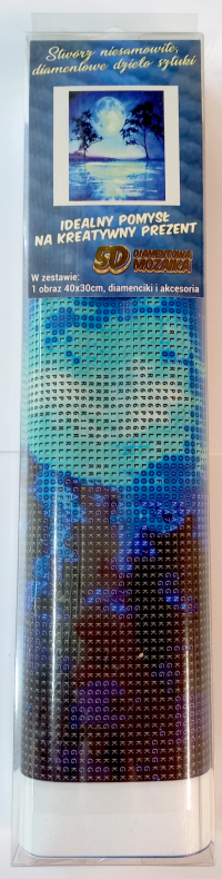 Balenie obsahuje: plátno s predtlačeným obrázkom, pero na aplikáciu kamienkov, misku na vysypanie kamienkov, vosk na nalepenie, sadu farebných kamienkov Diamantové maľovanie - postup: Horná strana plátna je potiahnutá lepidlom a prekrytá priehľadnou fóliou. Fóliu dávajte dole postupne po častiach tak, ako budete aplikovať kamienky. Pri sňatí celej fólie naraz sa môže lepiaca vrstva znečistiť a kamienky by nemuseli tak dobre držať. Plátno obsahuje znaky, ktoré sú uvedené v priloženej legende a odkazujú na príslušné vrecko s kamienkami označené číslom. Kamienky z daného vrecka vysypte do misky. Do hrotu pera naberte vosk, vďaka ktorému sa kamienky ľahko prichytia na pero. Kamienky perom nanášajte na obrázok. Po nalepení danej farby kamienky nasypte späť do vrecka a pokračujte s ďalšou farbou.