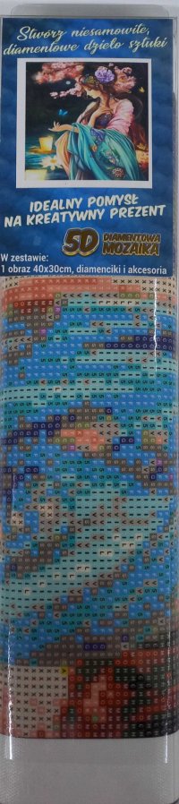 Balenie obsahuje: plátno s predtlačeným obrázkom, pero na aplikáciu kamienkov, misku na vysypanie kamienkov, vosk na nalepenie, sadu farebných kamienkov Diamantové maľovanie - postup: Horná strana plátna je potiahnutá lepidlom a prekrytá priehľadnou fóliou. Fóliu dávajte dole postupne po častiach tak, ako budete aplikovať kamienky. Pri sňatí celej fólie naraz sa môže lepiaca vrstva znečistiť a kamienky by nemuseli tak dobre držať. Plátno obsahuje znaky, ktoré sú uvedené v priloženej legende a odkazujú na príslušné vrecko s kamienkami označené číslom. Kamienky z daného vrecka vysypte do misky. Do hrotu pera naberte vosk, vďaka ktorému sa kamienky ľahko prichytia na pero. Kamienky perom nanášajte na obrázok. Po nalepení danej farby kamienky nasypte späť do vrecka a pokračujte s ďalšou farbou.