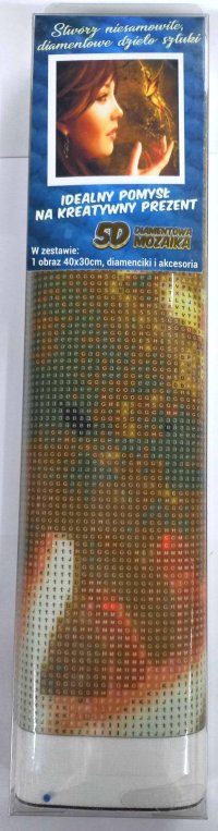 Balenie obsahuje: plátno s predtlačeným obrázkom, pero na aplikáciu kamienkov, misku na vysypanie kamienkov, vosk na nalepenie, sadu farebných kamienkov Diamantové maľovanie - postup: Horná strana plátna je potiahnutá lepidlom a prekrytá priehľadnou fóliou. Fóliu dávajte dole postupne po častiach tak, ako budete aplikovať kamienky. Pri sňatí celej fólie naraz sa môže lepiaca vrstva znečistiť a kamienky by nemuseli tak dobre držať. Plátno obsahuje znaky, ktoré sú uvedené v priloženej legende a odkazujú na príslušné vrecko s kamienkami označené číslom. Kamienky z daného vrecka vysypte do misky. Do hrotu pera naberte vosk, vďaka ktorému sa kamienky ľahko prichytia na pero. Kamienky perom nanášajte na obrázok. Po nalepení danej farby kamienky nasypte späť do vrecka a pokračujte s ďalšou farbou.