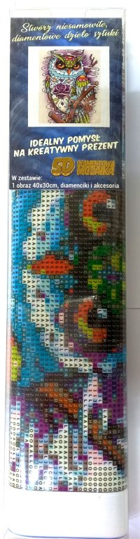 Balenie obsahuje: plátno s predtlačeným obrázkom, pero na aplikáciu kamienkov, misku na vysypanie kamienkov, vosk na nalepenie, sadu farebných kamienkov Diamantové maľovanie - postup: Horná strana plátna je potiahnutá lepidlom a prekrytá priehľadnou fóliou. Fóliu dávajte dole postupne po častiach tak, ako budete aplikovať kamienky. Pri sňatí celej fólie naraz sa môže lepiaca vrstva znečistiť a kamienky by nemuseli tak dobre držať. Plátno obsahuje znaky, ktoré sú uvedené v priloženej legende a odkazujú na príslušné vrecko s kamienkami označené číslom. Kamienky z daného vrecka vysypte do misky. Do hrotu pera naberte vosk, vďaka ktorému sa kamienky ľahko prichytia na pero. Kamienky perom nanášajte na obrázok. Po nalepení danej farby kamienky nasypte späť do vrecka a pokračujte s ďalšou farbou.