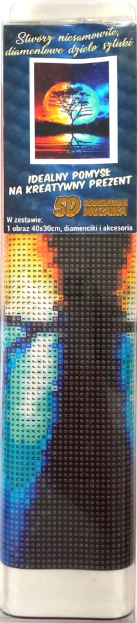 Balenie obsahuje: plátno s predtlačeným obrázkom, pero na aplikáciu kamienkov, misku na vysypanie kamienkov, vosk na nalepenie, sadu farebných kamienkov Diamantové maľovanie - postup: Horná strana plátna je potiahnutá lepidlom a prekrytá priehľadnou fóliou. Fóliu dávajte dole postupne po častiach tak, ako budete aplikovať kamienky. Pri sňatí celej fólie naraz sa môže lepiaca vrstva znečistiť a kamienky by nemuseli tak dobre držať. Plátno obsahuje znaky, ktoré sú uvedené v priloženej legende a odkazujú na príslušné vrecko s kamienkami označené číslom. Kamienky z daného vrecka vysypte do misky. Do hrotu pera naberte vosk, vďaka ktorému sa kamienky ľahko prichytia na pero. Kamienky perom nanášajte na obrázok. Po nalepení danej farby kamienky nasypte späť do vrecka a pokračujte s ďalšou farbou.