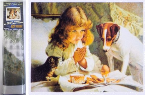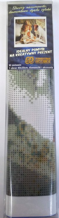 Balenie obsahuje: plátno s predtlačeným obrázkom, pero na aplikáciu kamienkov, misku na vysypanie kamienkov, vosk na nalepenie, sadu farebných kamienkov Diamantové maľovanie - postup: Horná strana plátna je potiahnutá lepidlom a prekrytá priehľadnou fóliou. Fóliu dávajte dole postupne po častiach tak, ako budete aplikovať kamienky. Pri sňatí celej fólie naraz sa môže lepiaca vrstva znečistiť a kamienky by nemuseli tak dobre držať. Plátno obsahuje znaky, ktoré sú uvedené v priloženej legende a odkazujú na príslušné vrecko s kamienkami označené číslom. Kamienky z daného vrecka vysypte do misky. Do hrotu pera naberte vosk, vďaka ktorému sa kamienky ľahko prichytia na pero. Kamienky perom nanášajte na obrázok. Po nalepení danej farby kamienky nasypte späť do vrecka a pokračujte s ďalšou farbou.