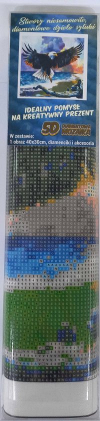 Balenie obsahuje: plátno s predtlačeným obrázkom, pero na aplikáciu kamienkov, misku na vysypanie kamienkov, vosk na nalepenie, sadu farebných kamienkov Diamantové maľovanie - postup: Horná strana plátna je potiahnutá lepidlom a prekrytá priehľadnou fóliou. Fóliu dávajte dole postupne po častiach tak, ako budete aplikovať kamienky. Pri sňatí celej fólie naraz sa môže lepiaca vrstva znečistiť a kamienky by nemuseli tak dobre držať. Plátno obsahuje znaky, ktoré sú uvedené v priloženej legende a odkazujú na príslušné vrecko s kamienkami označené číslom. Kamienky z daného vrecka vysypte do misky. Do hrotu pera naberte vosk, vďaka ktorému sa kamienky ľahko prichytia na pero. Kamienky perom nanášajte na obrázok. Po nalepení danej farby kamienky nasypte späť do vrecka a pokračujte s ďalšou farbou.