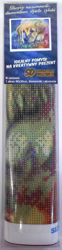 Balenie obsahuje: plátno s predtlačeným obrázkom, pero na aplikáciu kamienkov, misku na vysypanie kamienkov, vosk na nalepenie, sadu farebných kamienkov Diamantové maľovanie - postup: Horná strana plátna je potiahnutá lepidlom a prekrytá priehľadnou fóliou. Fóliu dávajte dole postupne po častiach tak, ako budete aplikovať kamienky. Pri sňatí celej fólie naraz sa môže lepiaca vrstva znečistiť a kamienky by nemuseli tak dobre držať. Plátno obsahuje znaky, ktoré sú uvedené v priloženej legende a odkazujú na príslušné vrecko s kamienkami označené číslom. Kamienky z daného vrecka vysypte do misky. Do hrotu pera naberte vosk, vďaka ktorému sa kamienky ľahko prichytia na pero. Kamienky perom nanášajte na obrázok. Po nalepení danej farby kamienky nasypte späť do vrecka a pokračujte s ďalšou farbou.