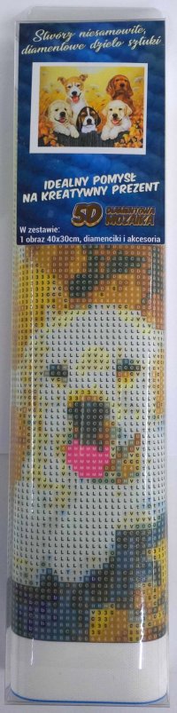Balenie obsahuje: plátno s predtlačeným obrázkom, pero na aplikáciu kamienkov, misku na vysypanie kamienkov, vosk na nalepenie, sadu farebných kamienkov Diamantové maľovanie - postup: Horná strana plátna je potiahnutá lepidlom a prekrytá priehľadnou fóliou. Fóliu dávajte dole postupne po častiach tak, ako budete aplikovať kamienky. Pri sňatí celej fólie naraz sa môže lepiaca vrstva znečistiť a kamienky by nemuseli tak dobre držať. Plátno obsahuje znaky, ktoré sú uvedené v priloženej legende a odkazujú na príslušné vrecko s kamienkami označené číslom. Kamienky z daného vrecka vysypte do misky. Do hrotu pera naberte vosk, vďaka ktorému sa kamienky ľahko prichytia na pero. Kamienky perom nanášajte na obrázok. Po nalepení danej farby kamienky nasypte späť do vrecka a pokračujte s ďalšou farbou.