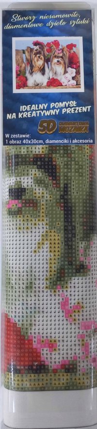 Balenie obsahuje: plátno s predtlačeným obrázkom, pero na aplikáciu kamienkov, misku na vysypanie kamienkov, vosk na nalepenie, sadu farebných kamienkov Diamantové maľovanie - postup: Horná strana plátna je potiahnutá lepidlom a prekrytá priehľadnou fóliou. Fóliu dávajte dole postupne po častiach tak, ako budete aplikovať kamienky. Pri sňatí celej fólie naraz sa môže lepiaca vrstva znečistiť a kamienky by nemuseli tak dobre držať. Plátno obsahuje znaky, ktoré sú uvedené v priloženej legende a odkazujú na príslušné vrecko s kamienkami označené číslom. Kamienky z daného vrecka vysypte do misky. Do hrotu pera naberte vosk, vďaka ktorému sa kamienky ľahko prichytia na pero. Kamienky perom nanášajte na obrázok. Po nalepení danej farby kamienky nasypte späť do vrecka a pokračujte s ďalšou farbou.