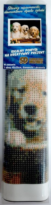 Balenie obsahuje: plátno s predtlačeným obrázkom, pero na aplikáciu kamienkov, misku na vysypanie kamienkov, vosk na nalepenie, sadu farebných kamienkov Diamantové maľovanie - postup: Horná strana plátna je potiahnutá lepidlom a prekrytá priehľadnou fóliou. Fóliu dávajte dole postupne po častiach tak, ako budete aplikovať kamienky. Pri sňatí celej fólie naraz sa môže lepiaca vrstva znečistiť a kamienky by nemuseli tak dobre držať. Plátno obsahuje znaky, ktoré sú uvedené v priloženej legende a odkazujú na príslušné vrecko s kamienkami označené číslom. Kamienky z daného vrecka vysypte do misky. Do hrotu pera naberte vosk, vďaka ktorému sa kamienky ľahko prichytia na pero. Kamienky perom nanášajte na obrázok. Po nalepení danej farby kamienky nasypte späť do vrecka a pokračujte s ďalšou farbou.