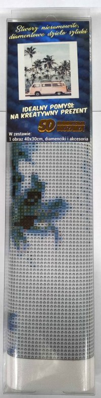 Balenie obsahuje: plátno s predtlačeným obrázkom, pero na aplikáciu kamienkov, misku na vysypanie kamienkov, vosk na nalepenie, sadu farebných kamienkov Diamantové maľovanie - postup: Horná strana plátna je potiahnutá lepidlom a prekrytá priehľadnou fóliou. Fóliu dávajte dole postupne po častiach tak, ako budete aplikovať kamienky. Pri sňatí celej fólie naraz sa môže lepiaca vrstva znečistiť a kamienky by nemuseli tak dobre držať. Plátno obsahuje znaky, ktoré sú uvedené v priloženej legende a odkazujú na príslušné vrecko s kamienkami označené číslom. Kamienky z daného vrecka vysypte do misky. Do hrotu pera naberte vosk, vďaka ktorému sa kamienky ľahko prichytia na pero. Kamienky perom nanášajte na obrázok. Po nalepení danej farby kamienky nasypte späť do vrecka a pokračujte s ďalšou farbou.