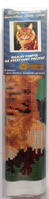 Balenie obsahuje: plátno s predtlačeným obrázkom, pero na aplikáciu kamienkov, misku na vysypanie kamienkov, vosk na nalepenie, sadu farebných kamienkov Diamantové maľovanie - postup: Horná strana plátna je potiahnutá lepidlom a prekrytá priehľadnou fóliou. Fóliu dávajte dole postupne po častiach tak, ako budete aplikovať kamienky. Pri sňatí celej fólie naraz sa môže lepiaca vrstva znečistiť a kamienky by nemuseli tak dobre držať. Plátno obsahuje znaky, ktoré sú uvedené v priloženej legende a odkazujú na príslušné vrecko s kamienkami označené číslom. Kamienky z daného vrecka vysypte do misky. Do hrotu pera naberte vosk, vďaka ktorému sa kamienky ľahko prichytia na pero. Kamienky perom nanášajte na obrázok. Po nalepení danej farby kamienky nasypte späť do vrecka a pokračujte s ďalšou farbou.