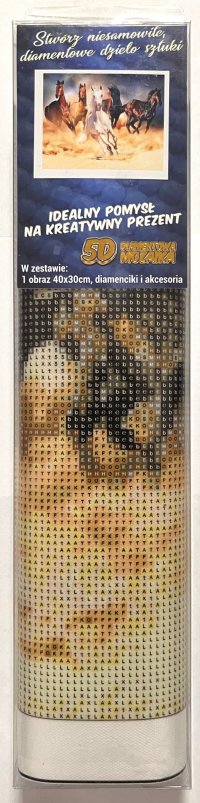 Balenie obsahuje: plátno s predtlačeným obrázkom, pero na aplikáciu kamienkov, misku na vysypanie kamienkov, vosk na nalepenie, sadu farebných kamienkov Diamantové maľovanie - postup: Horná strana plátna je potiahnutá lepidlom a prekrytá priehľadnou fóliou. Fóliu dávajte dole postupne po častiach tak, ako budete aplikovať kamienky. Pri sňatí celej fólie naraz sa môže lepiaca vrstva znečistiť a kamienky by nemuseli tak dobre držať. Plátno obsahuje znaky, ktoré sú uvedené v priloženej legende a odkazujú na príslušné vrecko s kamienkami označené číslom. Kamienky z daného vrecka vysypte do misky. Do hrotu pera naberte vosk, vďaka ktorému sa kamienky ľahko prichytia na pero. Kamienky perom nanášajte na obrázok. Po nalepení danej farby kamienky nasypte späť do vrecka a pokračujte s ďalšou farbou.