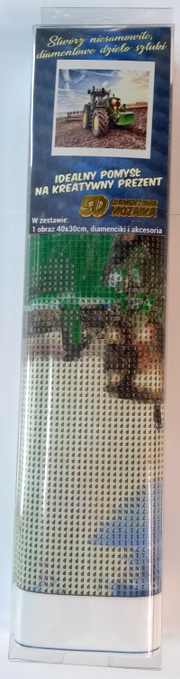 Balenie obsahuje: plátno s predtlačeným obrázkom, pero na aplikáciu kamienkov, misku na vysypanie kamienkov, vosk na nalepenie, sadu farebných kamienkov Diamantové maľovanie - postup: Horná strana plátna je potiahnutá lepidlom a prekrytá priehľadnou fóliou. Fóliu dávajte dole postupne po častiach tak, ako budete aplikovať kamienky. Pri sňatí celej fólie naraz sa môže lepiaca vrstva znečistiť a kamienky by nemuseli tak dobre držať. Plátno obsahuje znaky, ktoré sú uvedené v priloženej legende a odkazujú na príslušné vrecko s kamienkami označené číslom. Kamienky z daného vrecka vysypte do misky. Do hrotu pera naberte vosk, vďaka ktorému sa kamienky ľahko prichytia na pero. Kamienky perom nanášajte na obrázok. Po nalepení danej farby kamienky nasypte späť do vrecka a pokračujte s ďalšou farbou.
