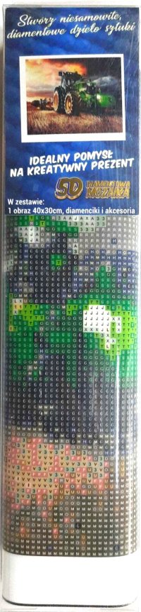 Balenie obsahuje: plátno s predtlačeným obrázkom, pero na aplikáciu kamienkov, misku na vysypanie kamienkov, vosk na nalepenie, sadu farebných kamienkov Diamantové maľovanie - postup: Horná strana plátna je potiahnutá lepidlom a prekrytá priehľadnou fóliou. Fóliu dávajte dole postupne po častiach tak, ako budete aplikovať kamienky. Pri sňatí celej fólie naraz sa môže lepiaca vrstva znečistiť a kamienky by nemuseli tak dobre držať. Plátno obsahuje znaky, ktoré sú uvedené v priloženej legende a odkazujú na príslušné vrecko s kamienkami označené číslom. Kamienky z daného vrecka vysypte do misky. Do hrotu pera naberte vosk, vďaka ktorému sa kamienky ľahko prichytia na pero. Kamienky perom nanášajte na obrázok. Po nalepení danej farby kamienky nasypte späť do vrecka a pokračujte s ďalšou farbou.