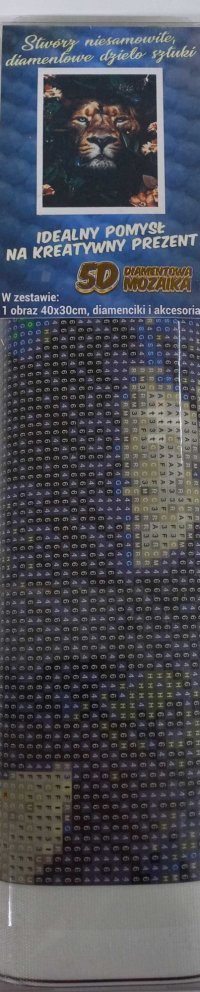 Balenie obsahuje: plátno s predtlačeným obrázkom, pero na aplikáciu kamienkov, misku na vysypanie kamienkov, vosk na nalepenie, sadu farebných kamienkov Diamantové maľovanie - postup: Horná strana plátna je potiahnutá lepidlom a prekrytá priehľadnou fóliou. Fóliu dávajte dole postupne po častiach tak, ako budete aplikovať kamienky. Pri sňatí celej fólie naraz sa môže lepiaca vrstva znečistiť a kamienky by nemuseli tak dobre držať. Plátno obsahuje znaky, ktoré sú uvedené v priloženej legende a odkazujú na príslušné vrecko s kamienkami označené číslom. Kamienky z daného vrecka vysypte do misky. Do hrotu pera naberte vosk, vďaka ktorému sa kamienky ľahko prichytia na pero. Kamienky perom nanášajte na obrázok. Po nalepení danej farby kamienky nasypte späť do vrecka a pokračujte s ďalšou farbou.