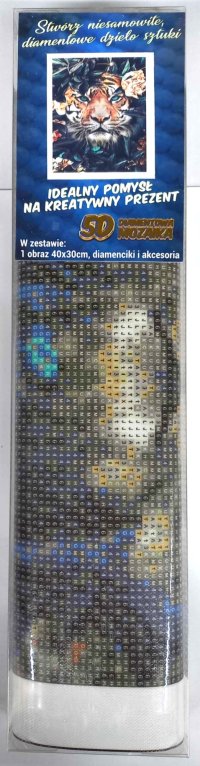 Balenie obsahuje: plátno s predtlačeným obrázkom, pero na aplikáciu kamienkov, misku na vysypanie kamienkov, vosk na nalepenie, sadu farebných kamienkov Diamantové maľovanie - postup: Horná strana plátna je potiahnutá lepidlom a prekrytá priehľadnou fóliou. Fóliu dávajte dole postupne po častiach tak, ako budete aplikovať kamienky. Pri sňatí celej fólie naraz sa môže lepiaca vrstva znečistiť a kamienky by nemuseli tak dobre držať. Plátno obsahuje znaky, ktoré sú uvedené v priloženej legende a odkazujú na príslušné vrecko s kamienkami označené číslom. Kamienky z daného vrecka vysypte do misky. Do hrotu pera naberte vosk, vďaka ktorému sa kamienky ľahko prichytia na pero. Kamienky perom nanášajte na obrázok. Po nalepení danej farby kamienky nasypte späť do vrecka a pokračujte s ďalšou farbou.
