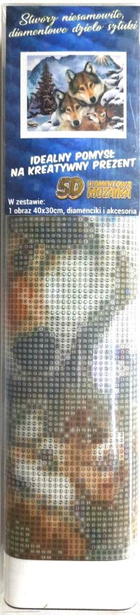 Balenie obsahuje: plátno s predtlačeným obrázkom, pero na aplikáciu kamienkov, misku na vysypanie kamienkov, vosk na nalepenie, sadu farebných kamienkov Diamantové maľovanie - postup: Horná strana plátna je potiahnutá lepidlom a prekrytá priehľadnou fóliou. Fóliu dávajte dole postupne po častiach tak, ako budete aplikovať kamienky. Pri sňatí celej fólie naraz sa môže lepiaca vrstva znečistiť a kamienky by nemuseli tak dobre držať. Plátno obsahuje znaky, ktoré sú uvedené v priloženej legende a odkazujú na príslušné vrecko s kamienkami označené číslom. Kamienky z daného vrecka vysypte do misky. Do hrotu pera naberte vosk, vďaka ktorému sa kamienky ľahko prichytia na pero. Kamienky perom nanášajte na obrázok. Po nalepení danej farby kamienky nasypte späť do vrecka a pokračujte s ďalšou farbou.