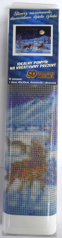 Balenie obsahuje: plátno s predtlačeným obrázkom, pero na aplikáciu kamienkov, misku na vysypanie kamienkov, vosk na nalepenie, sadu farebných kamienkov Diamantové maľovanie - postup: Horná strana plátna je potiahnutá lepidlom a prekrytá priehľadnou fóliou. Fóliu dávajte dole postupne po častiach tak, ako budete aplikovať kamienky. Pri sňatí celej fólie naraz sa môže lepiaca vrstva znečistiť a kamienky by nemuseli tak dobre držať. Plátno obsahuje znaky, ktoré sú uvedené v priloženej legende a odkazujú na príslušné vrecko s kamienkami označené číslom. Kamienky z daného vrecka vysypte do misky. Do hrotu pera naberte vosk, vďaka ktorému sa kamienky ľahko prichytia na pero. Kamienky perom nanášajte na obrázok. Po nalepení danej farby kamienky nasypte späť do vrecka a pokračujte s ďalšou farbou.