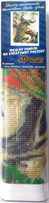 Balenie obsahuje: plátno s predtlačeným obrázkom, pero na aplikáciu kamienkov, misku na vysypanie kamienkov, vosk na nalepenie, sadu farebných kamienkov Diamantové maľovanie - postup: Horná strana plátna je potiahnutá lepidlom a prekrytá priehľadnou fóliou. Fóliu dávajte dole postupne po častiach tak, ako budete aplikovať kamienky. Pri sňatí celej fólie naraz sa môže lepiaca vrstva znečistiť a kamienky by nemuseli tak dobre držať. Plátno obsahuje znaky, ktoré sú uvedené v priloženej legende a odkazujú na príslušné vrecko s kamienkami označené číslom. Kamienky z daného vrecka vysypte do misky. Do hrotu pera naberte vosk, vďaka ktorému sa kamienky ľahko prichytia na pero. Kamienky perom nanášajte na obrázok. Po nalepení danej farby kamienky nasypte späť do vrecka a pokračujte s ďalšou farbou.