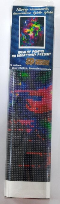 Balenie obsahuje: plátno s predtlačeným obrázkom, pero na aplikáciu kamienkov, misku na vysypanie kamienkov, vosk na nalepenie, sadu farebných kamienkov Diamantové maľovanie - postup: Horná strana plátna je potiahnutá lepidlom a prekrytá priehľadnou fóliou. Fóliu dávajte dole postupne po častiach tak, ako budete aplikovať kamienky. Pri sňatí celej fólie naraz sa môže lepiaca vrstva znečistiť a kamienky by nemuseli tak dobre držať. Plátno obsahuje znaky, ktoré sú uvedené v priloženej legende a odkazujú na príslušné vrecko s kamienkami označené číslom. Kamienky z daného vrecka vysypte do misky. Do hrotu pera naberte vosk, vďaka ktorému sa kamienky ľahko prichytia na pero. Kamienky perom nanášajte na obrázok. Po nalepení danej farby kamienky nasypte späť do vrecka a pokračujte s ďalšou farbou.