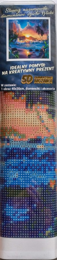 Balenie obsahuje: plátno s predtlačeným obrázkom, pero na aplikáciu kamienkov, misku na vysypanie kamienkov, vosk na nalepenie, sadu farebných kamienkov Diamantové maľovanie - postup: Horná strana plátna je potiahnutá lepidlom a prekrytá priehľadnou fóliou. Fóliu dávajte dole postupne po častiach tak, ako budete aplikovať kamienky. Pri sňatí celej fólie naraz sa môže lepiaca vrstva znečistiť a kamienky by nemuseli tak dobre držať. Plátno obsahuje znaky, ktoré sú uvedené v priloženej legende a odkazujú na príslušné vrecko s kamienkami označené číslom. Kamienky z daného vrecka vysypte do misky. Do hrotu pera naberte vosk, vďaka ktorému sa kamienky ľahko prichytia na pero. Kamienky perom nanášajte na obrázok. Po nalepení danej farby kamienky nasypte späť do vrecka a pokračujte s ďalšou farbou.