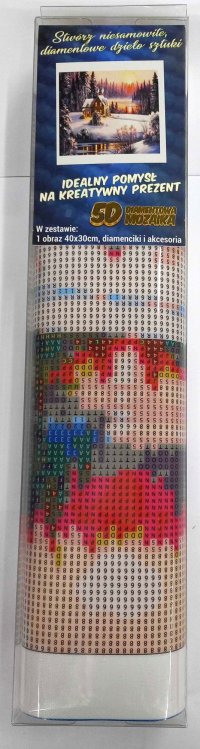 Balenie obsahuje: plátno s predtlačeným obrázkom, pero na aplikáciu kamienkov, misku na vysypanie kamienkov, vosk na nalepenie, sadu farebných kamienkov Diamantové maľovanie - postup: Horná strana plátna je potiahnutá lepidlom a prekrytá priehľadnou fóliou. Fóliu dávajte dole postupne po častiach tak, ako budete aplikovať kamienky. Pri sňatí celej fólie naraz sa môže lepiaca vrstva znečistiť a kamienky by nemuseli tak dobre držať. Plátno obsahuje znaky, ktoré sú uvedené v priloženej legende a odkazujú na príslušné vrecko s kamienkami označené číslom. Kamienky z daného vrecka vysypte do misky. Do hrotu pera naberte vosk, vďaka ktorému sa kamienky ľahko prichytia na pero. Kamienky perom nanášajte na obrázok. Po nalepení danej farby kamienky nasypte späť do vrecka a pokračujte s ďalšou farbou.