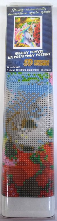 Balenie obsahuje: plátno s predtlačeným obrázkom, pero na aplikáciu kamienkov, misku na vysypanie kamienkov, vosk na nalepenie, sadu farebných kamienkov Diamantové maľovanie - postup: Horná strana plátna je potiahnutá lepidlom a prekrytá priehľadnou fóliou. Fóliu dávajte dole postupne po častiach tak, ako budete aplikovať kamienky. Pri sňatí celej fólie naraz sa môže lepiaca vrstva znečistiť a kamienky by nemuseli tak dobre držať. Plátno obsahuje znaky, ktoré sú uvedené v priloženej legende a odkazujú na príslušné vrecko s kamienkami označené číslom. Kamienky z daného vrecka vysypte do misky. Do hrotu pera naberte vosk, vďaka ktorému sa kamienky ľahko prichytia na pero. Kamienky perom nanášajte na obrázok. Po nalepení danej farby kamienky nasypte späť do vrecka a pokračujte s ďalšou farbou.