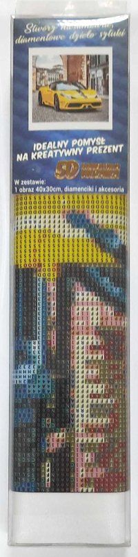 Balenie obsahuje: plátno s predtlačeným obrázkom, pero na aplikáciu kamienkov, misku na vysypanie kamienkov, vosk na nalepenie, sadu farebných kamienkov Diamantové maľovanie - postup: Horná strana plátna je potiahnutá lepidlom a prekrytá priehľadnou fóliou. Fóliu dávajte dole postupne po častiach tak, ako budete aplikovať kamienky. Pri sňatí celej fólie naraz sa môže lepiaca vrstva znečistiť a kamienky by nemuseli tak dobre držať. Plátno obsahuje znaky, ktoré sú uvedené v priloženej legende a odkazujú na príslušné vrecko s kamienkami označené číslom. Kamienky z daného vrecka vysypte do misky. Do hrotu pera naberte vosk, vďaka ktorému sa kamienky ľahko prichytia na pero. Kamienky perom nanášajte na obrázok. Po nalepení danej farby kamienky nasypte späť do vrecka a pokračujte s ďalšou farbou.