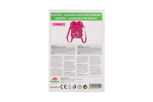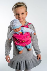 Detské nosítko pre dievčatká, v ktorom môžu nosiť svoje bábiky a medvedíky. Rozmer klokania vrecka je 29 x 20 cm, pri popruhoch je dĺžka nastaviteľná.