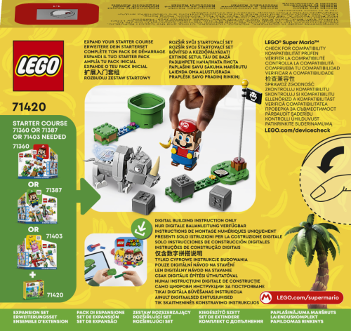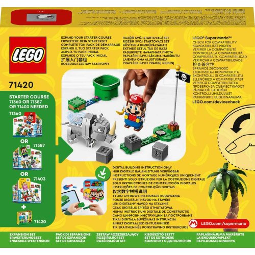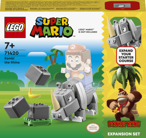 Pripravte sa na dobrodružstvo s rozširujúcim setom LEGO® Super Mario™ (71420) Nosorožec Rambi – rozširujúci set pre deti od 7 rokov. Obsahuje figúrku Rambiho z kociek LEGO®, na ktoré môžu jazdiť interaktívne figúrky LEGO® Mario™, LEGO® Luigi™ alebo LEGO® Peach™ (nie sú súčasťou balenia). Keď Rambi chodí, beží proti vrstviteľným prvkom kameňov a inak sa hýbe, aktivujú sa zvukové efekty interaktívnej figúrky. Poznámka: Pre interaktívny herný zážitok je potrebný niektorý zo štartovacích setov 71360, 71387 alebo 71403.
