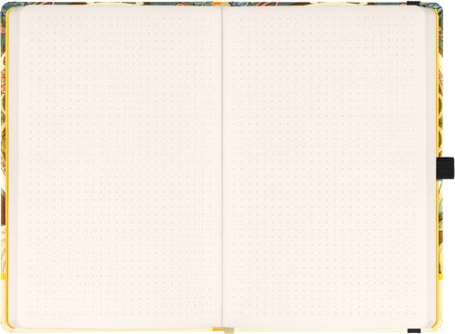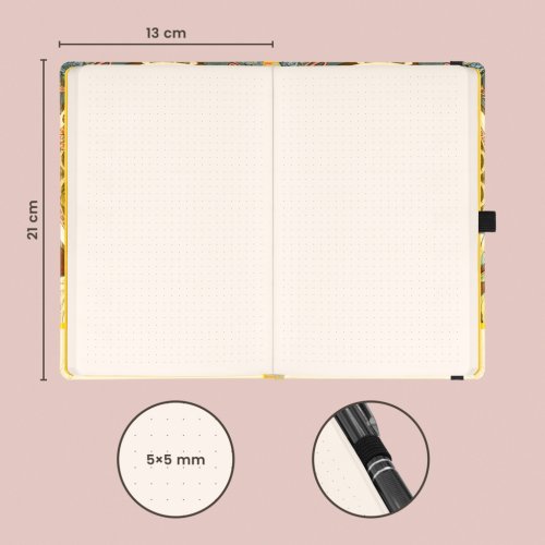 Notes v pevných doskách s motívom diela Alfonsa Muchu, s uzatváraním na gumičku, vreckom na drobnosti a pútkom na ceruzku. Vnútri nájdete 172 bodkovaných strán na žltom papieri na zapísanie všetkých vašich nápadov.