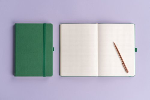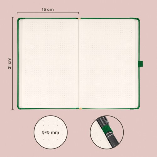 Bodkovaný notes Aprint v zelenom prevedení. Klasika aj elegancia, najžiadanejší povrch, na ktorý možno ľahko raziť firemné logá s jemnou štruktúrou.