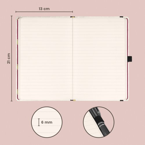 Kvalitný linajkový notes v pevných doskách s uzatváraním na gumičku, pútkom na ceruzku a vnútorným vreckom na drobnosti.
