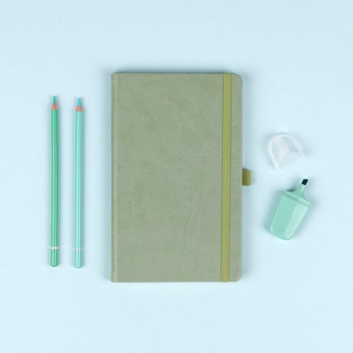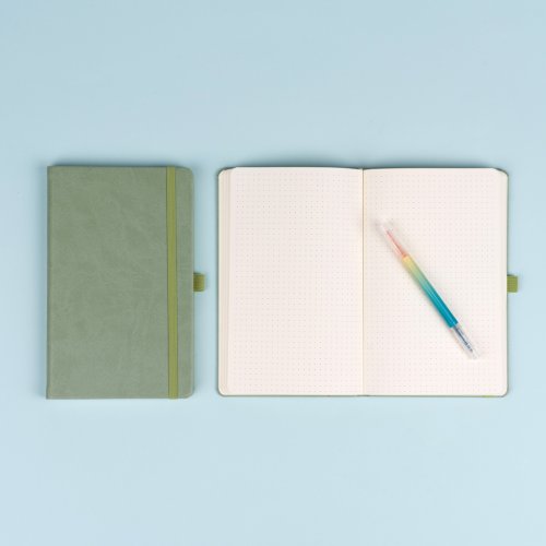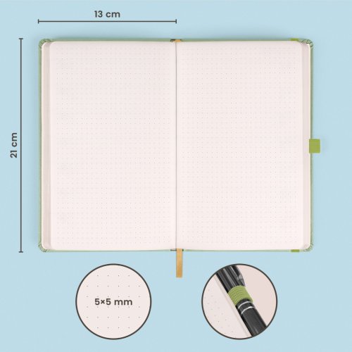 Praktický a ľahký bodkovaný notes v trendy zelenej farbe má povrch s jemnou štruktúrou, na ktorý si môžete nechať vyraziť logo spoločnosti. Notes má pevnú knižnú väzbu a zaguľatené rohy, pútko na ceruzku, elastickú gumičku a textilnú záložku. Bodky majú 5 mm a sú na kvalitnom žltom papieri.