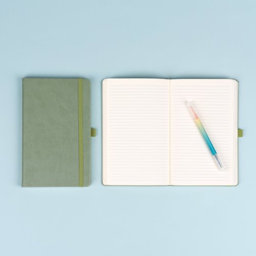 Praktický a ľahký linajkový notes v trendy zelenej farbe má povrch s jemnou štruktúrou, na ktorý si môžete nechať vyraziť logo spoločnosti. Notes má pevnú knižnú väzbu a zaguľatené rohy, pútko na ceruzku, elastickú gumičku a textilnú záložku. Linky majú 6 mm a sú na kvalitnom žltom papieri.