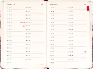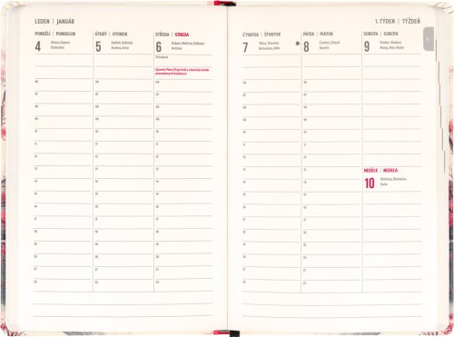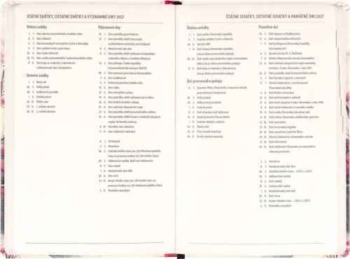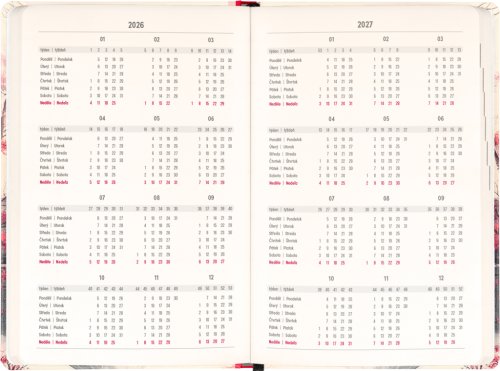 Osemnásťmesačný diár obsahuje prehľad na rok 2026 a 2027, zoznam českých a slovenských mien a česko-slovenské týždenné stĺpcové kalendárium s menami a sviatkami. Kalendárium začína v júli 2026 a končí v decembri 2027.