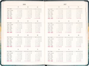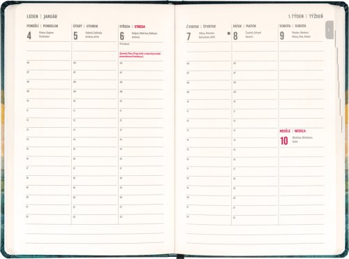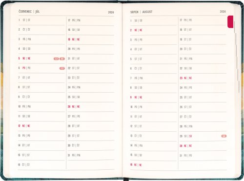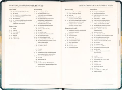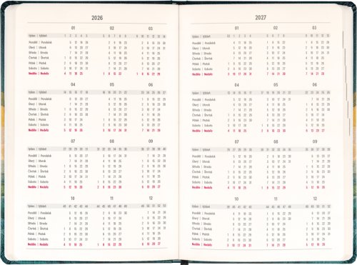 Osemnásťmesačný diár obsahuje prehľad na rok 2026 a 2027, zoznam českých a slovenských mien a česko-slovenské týždenné stĺpcové kalendárium s menami a sviatkami. Kalendárium začína v júli 2026 a končí v decembri 2027.