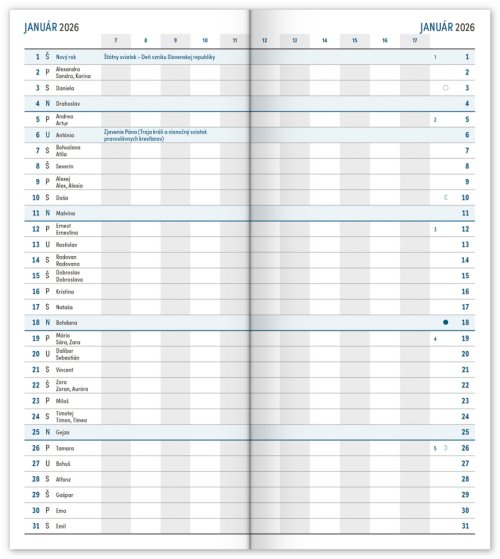 Praktický tenký diár v čiernej farbe s mesačným rozložením sa zmestí naozaj všade. Obsahuje slovenské kalendárium s menami, sviatkami a pamätnými dňami, pracovný kalendár, zoznam mien a prehľad na rok 2026 a 2027.