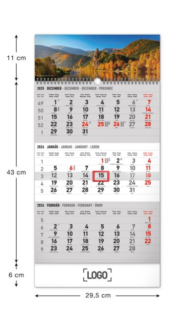 Praktický plánovací kalendár s trojmesačným rozložením, orientačnou lištou s posuvným jazdcom a užitočným ročným prehľadom. Obsahuje kalendárium so slovenskými menami a svetovými sviatkami na tmavo modrom pozadí.