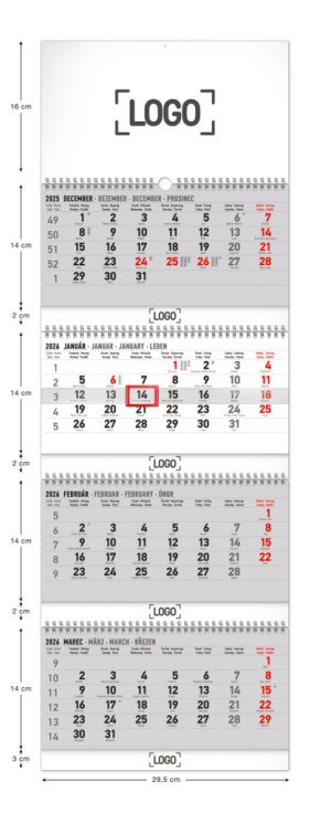 Praktický štvormesačný kalendár s plochou na potlač a náhľadom štyroch mesiacov súčasne môžete vďaka dvojitej špirále pohodlne zložiť do obálky veľkosti A4. Kalendárium obsahuje slovenské mená a svetové sviatky. Vďaka voľnej ploche na potlač sa môže stať úplne originálnym predmetom pre firmy.