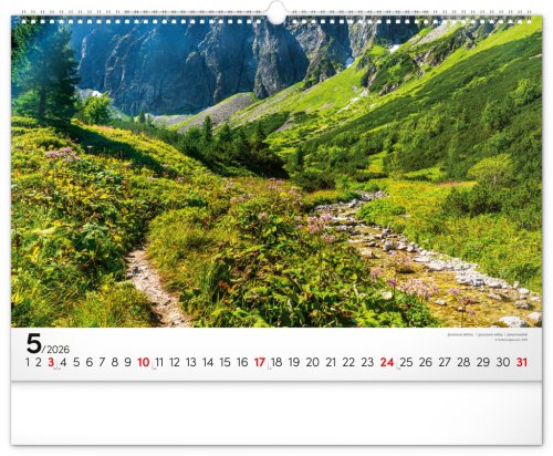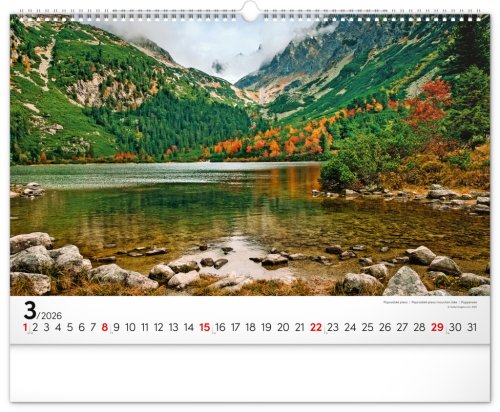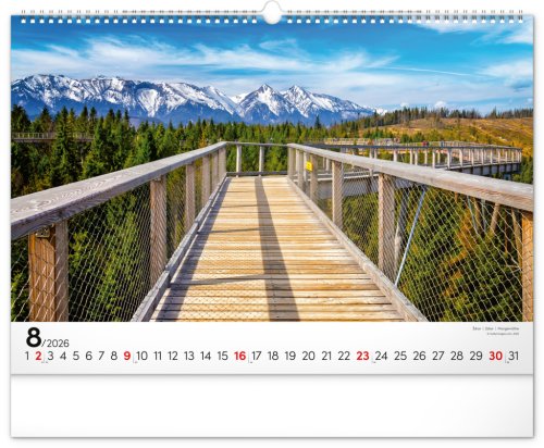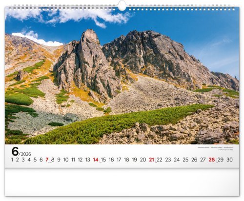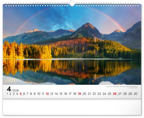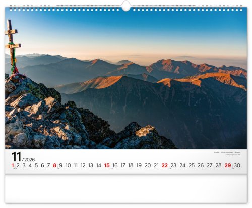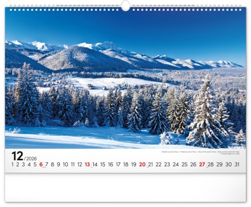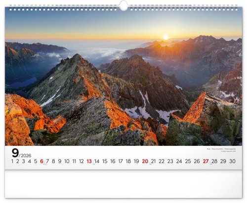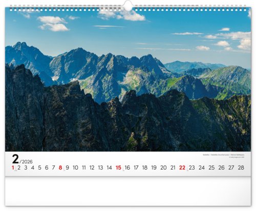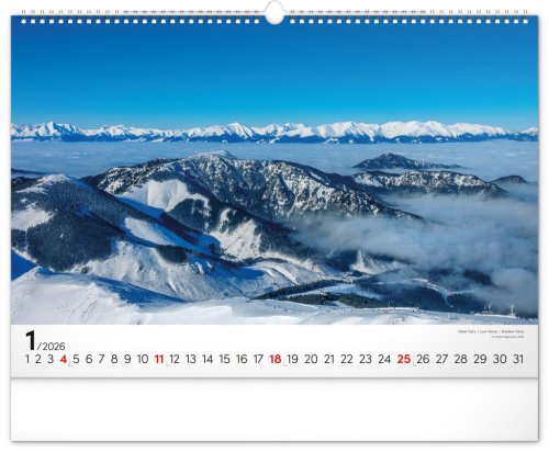 Dvanásť pôsobivých snímok zachytávajúcich majestnátnosť najvyššieho slovenského pohoria od západu po východ v šírkovom formáte. Fotografie sú doplnené jednoduchým kalendáriom na bielom pozadí.