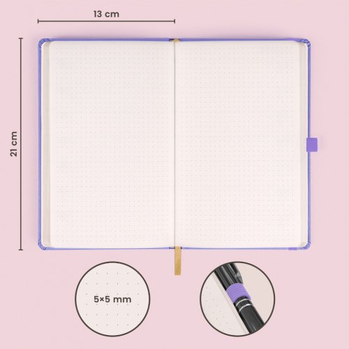 Praktický a ľahký bodkovaný notes v trendy farbe lila má povrch s jemnou štruktúrou, na ktorý si môžete nechať vyraziť logo spoločnosti. Notes má pevnú knižnú väzbu a zaguľatené rohy, pútko na ceruzku, elastickú gumičku a textilnú záložku. Bodky majú 5 mm a sú na kvalitnom žltom papieri.