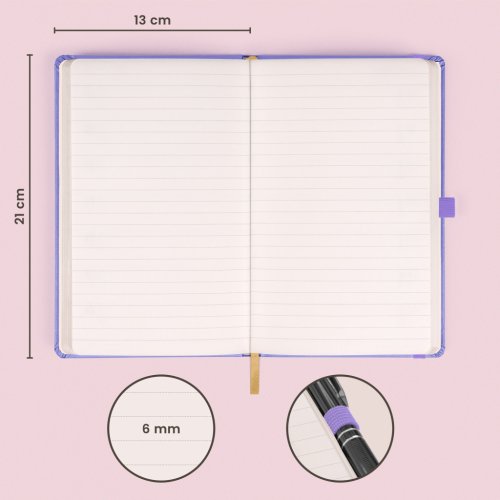 Praktický a ľahký linajkový notes v trendy farbe lila má povrch s jemnou štruktúrou, na ktorý si môžete nechať vyraziť logo spoločnosti. Notes má pevnú knižnú väzbu a zaguľatené rohy, pútko na ceruzku, elastickú gumičku a textilnú záložku. Linky majú 6 mm a sú na kvalitnom žltom papieri.