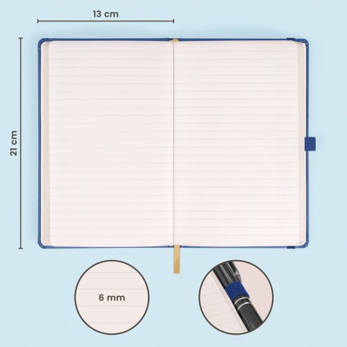 Praktický a ľahký linajkový notes v klasickej tmavo modrej farbe má povrch s hrubšou štruktúrou, na ktorý si môžete nechať vyraziť logo spoločnosti. Notes má pevnú knižnú väzbu a zaguľatené rohy, pútko na ceruzku, elastickú gumičku a textilnú záložku. Linky majú 6 mm a sú na kvalitnom žltom papieri.