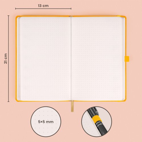 Praktický a ľahký bodkovaný notes v trendy žltej farbe má povrch s jemnou štruktúrou, na ktorý si môžete nechať vyraziť logo spoločnosti. Notes má pevnú knižnú väzbu a zaguľatené rohy, pútko na ceruzku, elastickú gumičku a textilnú záložku. Bodky majú 5 mm a sú na kvalitnom žltom papieri.