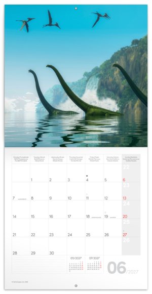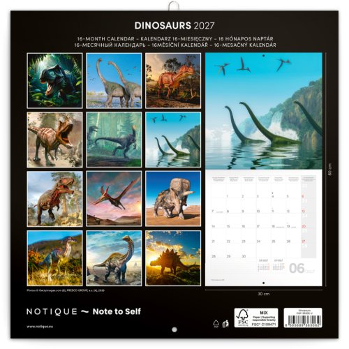 Poznámkový kalendár s vernými ilustráciami pravekých dinosaurov a šesťjazyčným kalendáriom prispôsobeným pre vaše plány a poznámky.